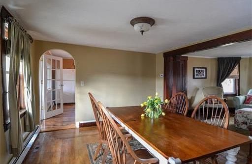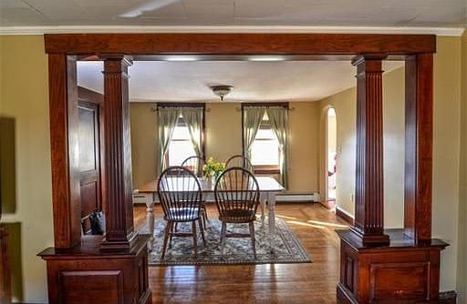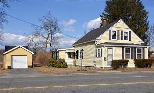 CHARMING antique colonial set near the road but has level usable private .68 lot behind home. Bright floor plan w/ hardwood floors, large dining room w/ columns that opens to spacious living room w/ walk out bay window. Eat-in kitchen w/ white cabs, updated bath w/ tile surround tub and newer vanity. Flexible floor plan offers first floor bedroom or comfortable family room and two bedrooms up. Sun room is great space for office or quiet reading spot. Replacement windows. Being sold "AS IS".