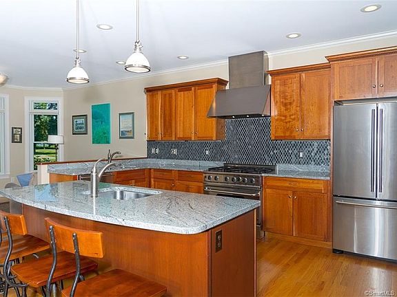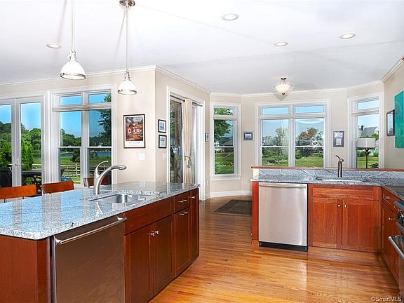 This Mason's Island luxury dream home showcases a custom great room with gourmet kitchen showcasing granite counter tops, cherry cabinetry, custom stone back-splash, 2 stainless sinks, 2 Bosch dishwashers, Capitol propane cook-top, and Sharp convection oven with microwave. The adjoining first floor living room maximizes the open floor plan with panoramic views of the Mystic River while winter evenings are cozy with a roaring custom Rumford fireplace with granite hearth. Dining room showcases custom chair rail and plantation shutters. The primary first floor bedroom suite is ideal for transitional living with walk-in closet, custom shades and ensuite. The luxuriating master bathroom has a gracious shower, radiant marble flooring, jet soaking tub accented with Carrara marble tile and private water closet. The upper bedrooms have water-views, spacious closets and full bath with 2 pedestal sinks and privacy shower room. Both upper bedrooms take advantage of the scenic overlook of the marsh preserve. The upper bonus room is 800 sf of additional storage space ideal for a media/recreation room, home office, or exercise space. Abundant natural light streams through-out this home which captures the essence of shoreline living in a pristine nautical community. Enjoy the outdoor panoramic water views while enjoying Al Fresco dining on your expansive Ipea decks. Home equipped with Generac 10K generator for unanticipated power outages. Washer/Dryer room off kitchen See drone reel.