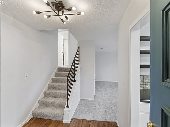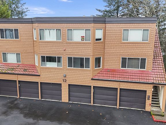 Oswego Summit's middle unit has views from the main level of trees and hills to the north. Updated appliances in the kitchen have engineered flooring. The eating area opens to the family room with a wood-burning fireplace. Wetbar and built-in shelving with brand-new carpet. upstairs features updated bathrooms and two bedrooms. The suite features a closet organizer and glass shower doors and a tile shower. Lake Oswego address and Portland Scholls.Private wrap-around deck with storage closet. The garage is the far right door closest to the unit.