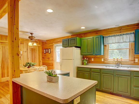 Tucked in the woods, this log cabin is ideal for privacy, while still being close to town and walking distance to the public beach on Kezar Lake. This home is the quintessential 4 season cabin with a fully wooded interior. Tons of natural light floods in through the skylights and all angles of the cabin. You'll find an open floor plan with vaulted ceilings and gorgeous wooden floors throughout the entire downstairs and a first floor bedroom. There's an abundance of built-in drawers and shelving throughout the upstairs and a large closet off the second floor bedroom. There's also additional living space in the partially finished basement with a half bath. Relax on your back porch overlooking your private backyard. Here's your chance to own property by the lake just in time for summer!