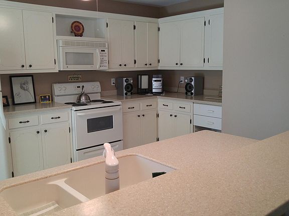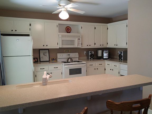 Gorgeous golf course view from almost every room! Wooded setting with golf course frontage off the back patio. Open floor plan with kitchen bar area to living and dining area. Solid surface counter tops, loads of kitchen cabinets. Newer sliding doors, vinyl windows, and water heater. Easy maintenance floors, newer carpet in bedrooms, many updates! End unit with easy living!