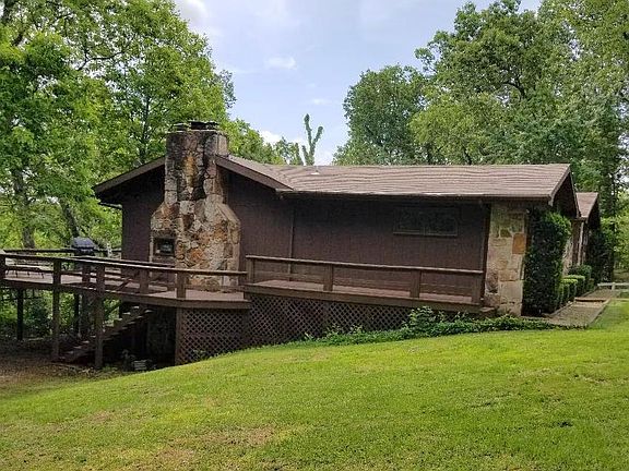 WELCOME HOME. Nestled among the trees above Bull Shoals Lake, this home is the perfect place to relax. This 'Gentleman's Ranch' features 2 bedrooms, living, dining and kitchen on the main level. There are 2 full baths, one with large walk-in cedar closet and dressing room. The lower level contains a 2-car garage, a full bath, den/bedroom and a work room with outside entrance. The very large deck boasts an outside fireplace for barbecuing or just enjoying on a cool summer evening. Located in a sportsman's paradise, there is plenty of hunting, fishing, hiking, and river and lake activities. The ten acre property includes a 24' x 54' bay barn with one rubber floored stall big enough for two horses, a hay storage bay and a workshop with concrete floors, garden shed, and two-car carport.
