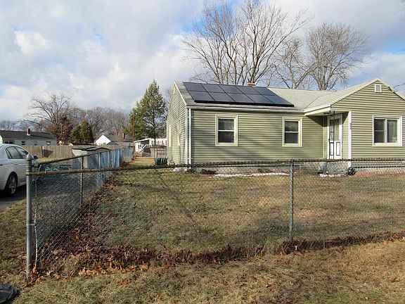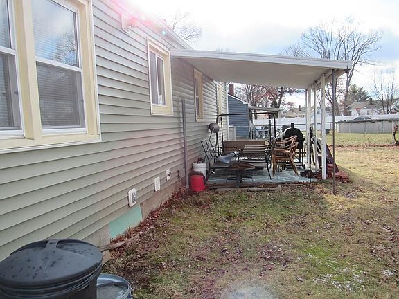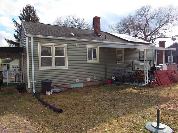 Adorable ranch away from busy roads with spacious fenced yard,2 sheds, carport & newer vinyl siding & covered patio in rear can also be used to park a boat or car, Updated birch cabinets in kitchen, double sink & microwave, pantry closet & dining area.Updated bathroom 3 years ago. Linen closet in the hall. Alarm system not in use. Newer solar panels keep electric bill down. See attachment for Solar information & seller's total electric cost. Buyer to assume Solar panel lease with no fees to assume & no monthly fees except for the electric cost. Jan. bill was $12.00. New fwa furnace, central air, vynil siding & new $2300. refrigerator less than 1 yr. old. Vinyl windows & gas htwtr, finished rec room in basement. Workbench & shelving to remain in basement. Seller may remove light over kitchen table.