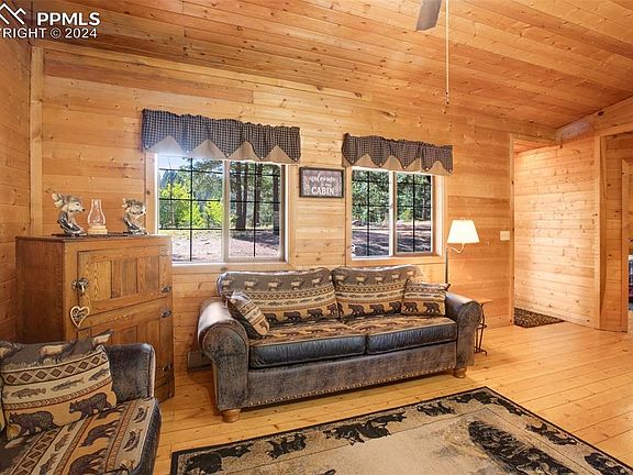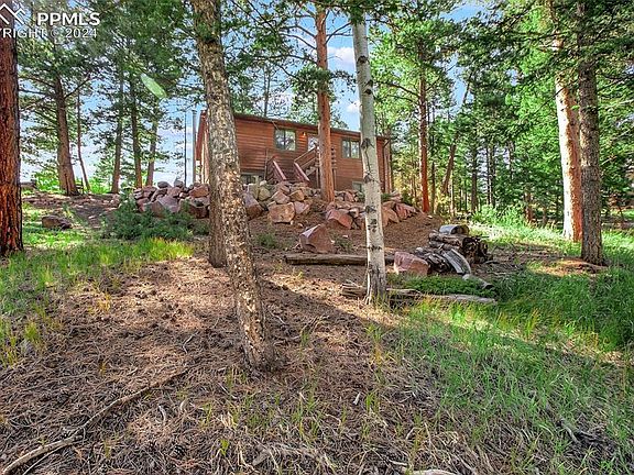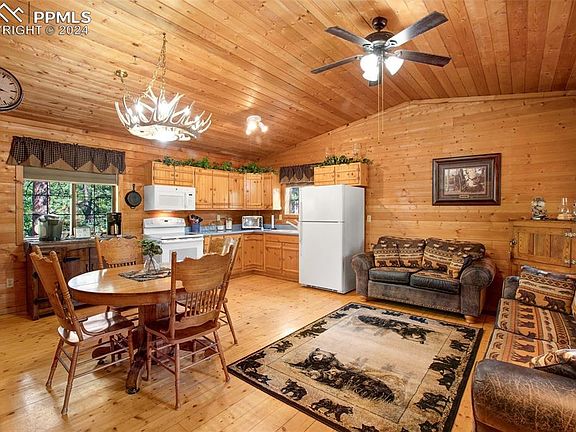 Here is the Spring Valley sweetheart you have been waiting for. Two bedrooms, two bath, and two living areas. Log sided rancher on over an acre. Nestled in the pines, located only a quarter of a mile off of the pavement. Rustic interior is very cozy. Pine cabinets in the kitchen, pine floors throughout the main level. Both bedrooms are located on the main level. Vaulted pine ceilings in the great room, for a nice open feel. Full hall bath separates the bedrooms. Spacious lower-level family room with Harmon woodstove. Three-quarter bath in the lower level. There is a good size storage/laundry room in the lower level as well. Community water system. Large mature pine trees and few aspen trees, flat pull through driveway, plenty of space to put a garage on the south side of the lot. Community has private large lake stocked with fish, and a couple of ponds. Easy access off of CR 5 with no large hills to climb. 10 minutes to downtown Divide and very close to National Forest. The 717 trail network is close by. This home will make a perfect full-time or part-time residence. The majority of the furniture, artwork, beds, and kitchenware, can be left with the home, or it can be removed. All you really need is to bring a kitchen table and chairs. Very peaceful setting in a terrific community! It's a pleasure to show!