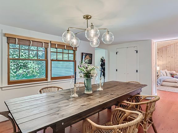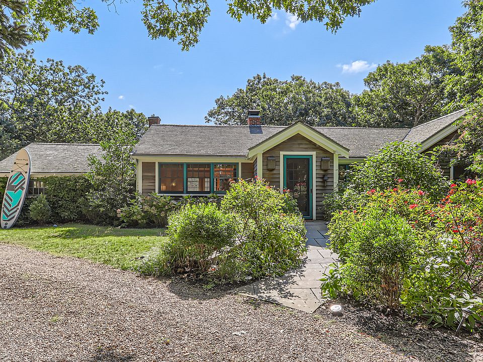 This charming Chilmark home sits on over 3 acres and features an updated, move-in ready home, expansive outdoor living space with deck, lawn and firepit area, and a six-bedroom septic system for future expansion. The welcoming foyer opens into the dining room, kitchen and a large airy living room with vaulted ceiling and stone fireplace. Beyond the kitchen there are two bedrooms and a shared bathroom, then a hallway leading to the primary suite with a walk-in closet, bathroom with separate tub and shower, and the spacious bedroom. Additionally, an attached garage is accessed from the back of the house and could serve as a seasonal rec room. Storage shed, bocce court, Chilmark beaches.