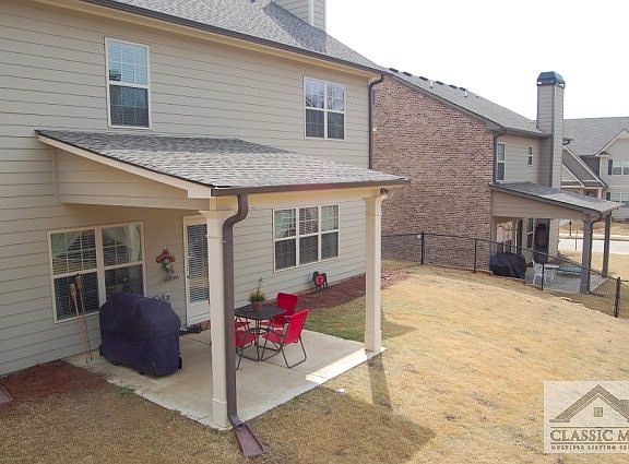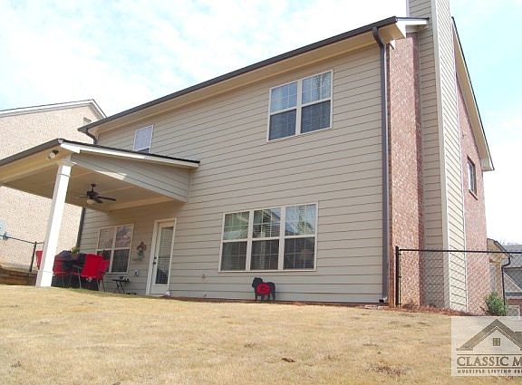 Centrally located between The Loop and Epps Bridge Pkwy is this inviting 2016 Towns Walk Cottage. The open concept begins upon entry into the two-story foyer that includes a sweet nook next to the coat closet and 1/2 bath. The wooden floors seemlessly join the foyer into the living room with fireplace and dining and kitchen area. The kitchen has granite countertops and kitchen island includes breakfast bar. Ample amounts of natural light stream through the windows overlooking a large back yard completely fenced in. Patio has covered roof with ceiling fan. Upstairs is the master suite with trey ceiling and en suite bath with soaking tub and tile shower and linen closet. Three more bedrooms upstairs include two with vaulted ceilings. Another full bath serves the ancillary bedrooms. Laundry room is upstairs as well. Two car garage has door leading to kitchen. HOA includes lawn care.