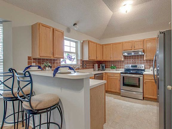 Large home on mature treed lot, 2 master suites! Great outdoor living space with covered deck w/ceiling fan and extended patio area! New carpet, new paint, updated kitchen w/vaulted ceiling & light fixtures, S/S appliances, Hardwood in dining area, Master bedroom w/trey ceiling, 2nd Master is currently being used as media room, Roof 2014, HVAC is a Trane. Home Warranty. Refrigerator negotiable. Closing Date needs to be flexible from end of April to end of May.