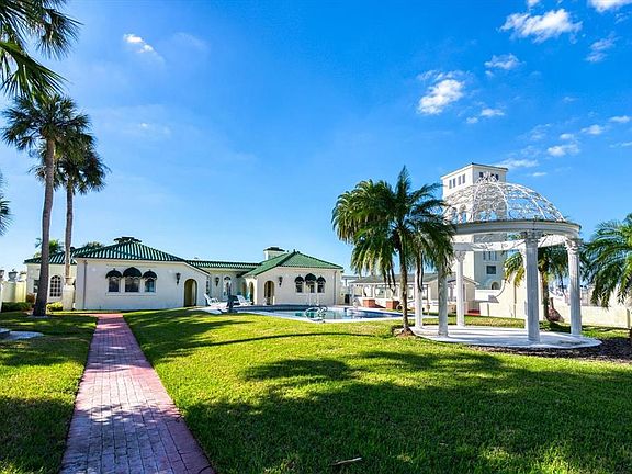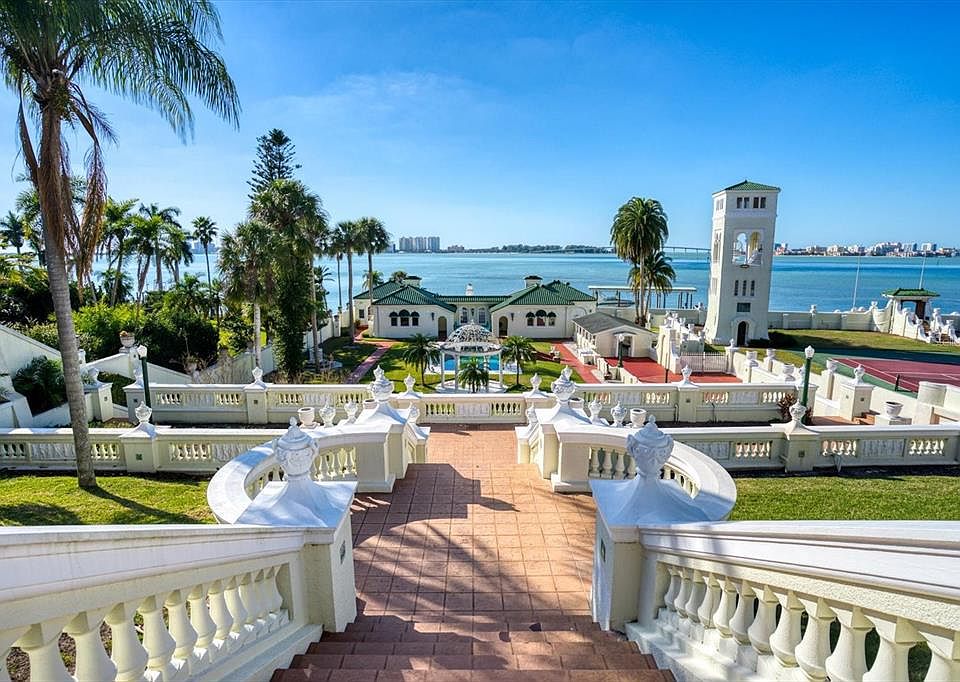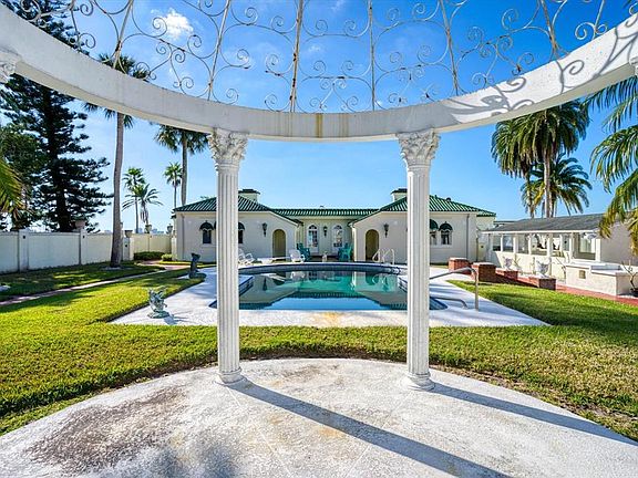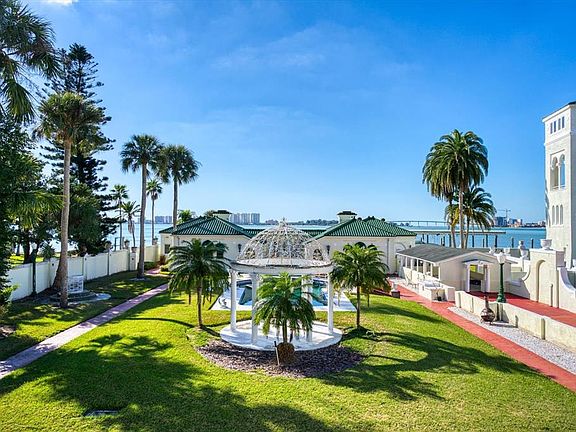 Unsurpassed Views and A Chance to Own a Piece of History awaits the buyer of the South House, a magical 2.75-acre property once associated with the legendary Century Oaks Estatewhich was built on the site of the original Fort Harrison. Positioned at the waters edge of the deepest and widest part of Clearwater Harbor, the view-inspired residence offers show-stopping views of the Gulf, Sand Key Bridge and the Clearwater skyline. Situated behind a private gate and surrounded by meticulously maintained gardens, the 3,046 square foot single-story design reflects an ambiance of casual elegance throughout. The open floor plan merges the family and dining rooms into one extra-large area that is ideal for entertaining as well as fine Florida living. A fireplace adds warmth and character to primary spaces while walls of glass doors reveal unobstructed Gulf views and open to an expansive terrace and adjoining boat dock. A charming gazebo adorned with stately Corinthian columns makes a delightful conversation area and combines with a swimming pool for an idyllic retreat. The adjacent kitchen is outfitted with an array of storage cabinets, granite countertops, breakfast bar and a cozy nook for casual dining. Private accommodations within the 3-bedroom plan include a master suite of generous proportions featuring a dramatic exposed beamed ceiling and a fireplace. The opportunity to build on the upper bluff of this property is significant for its stunning views and 50-feet elevation above sea levela rarity for waterfront properties in Florida and precluded from flood insurance requirements. Conveniently located in the heart of Clearwater, the home affords easy access to award-winning Gulf beaches, medical facilities, shopping and dining, and is a short drive to Tampa International Airport, downtown Tampa and St. Petersburg. Formerly known as the estates Boat House, this offering may again be joined with the Century Oaks property which is separately listed.
