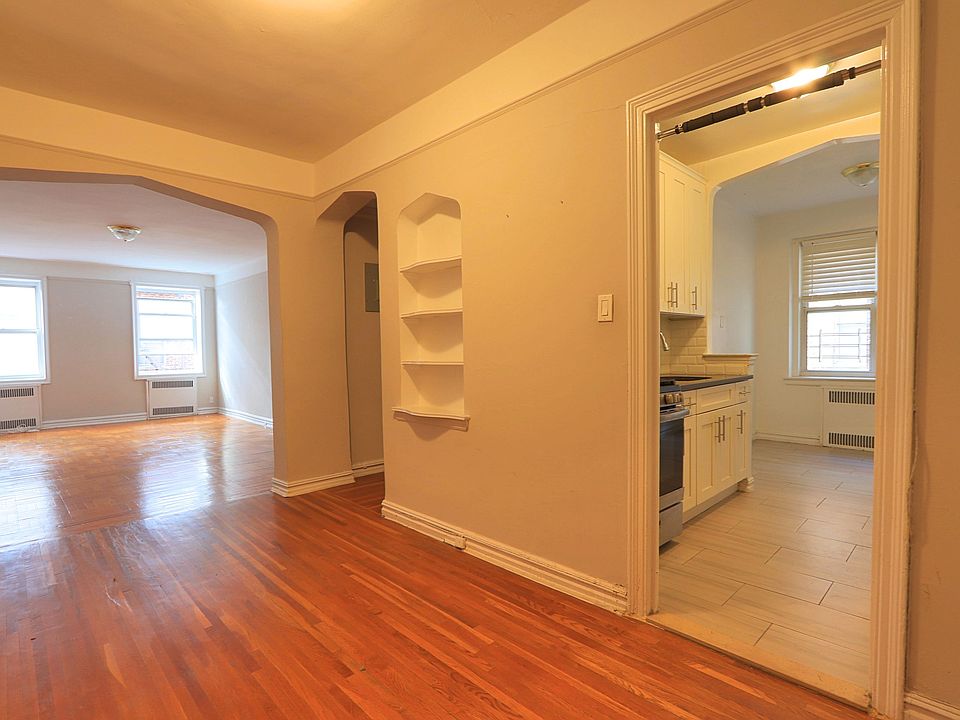 This spacious one-bedroom apartment is located in an elevator building with laundry facilities, facing the back of the building, offering a quiet environment. All rooms are accessed from the foyer, with the kitchen at the center of the apartment. The living room is generously sized, making it an ideal space for entertaining guests. The hardwood floors throughout are stunning. The kitchen features a galley layout with space for a table at the far end. The recently updated kitchen complements the overall design of the apartment. There are a closet outside of the bedroom, ideally a linen, as well as two additional closets in the bedroom for extra storage. The three windows in the bedroom allow for great airflow and abundant light. The room can comfortably accommodate a king-sized bed. The bathroom has has been renovated. Heat and hot water are included in the rent.
