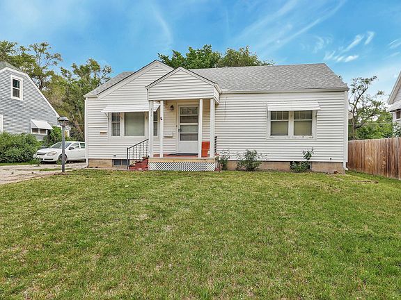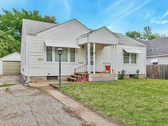 Great home in a good location close to highways and only around 15-20 minutes outside of north Wichita. This two bedroom one bath has a detached one car garage. The home has a nice front porch perfect for morning coffee. Inside the home has a large living room with a formal dining area with beautiful original hardwood floors throughout. Kitchen has a lot of cabinets for storage. The two bedrooms upstairs are a good size. There is a lot of natural light coming into this home. Downstairs has the laundry and could be finished out for more living space. Backyard has a covered back porch and almost completely fenced in and has a lot of privacy. Feel free to set up your showing today!