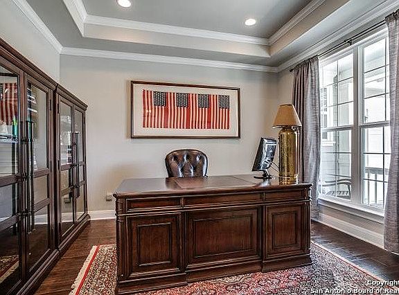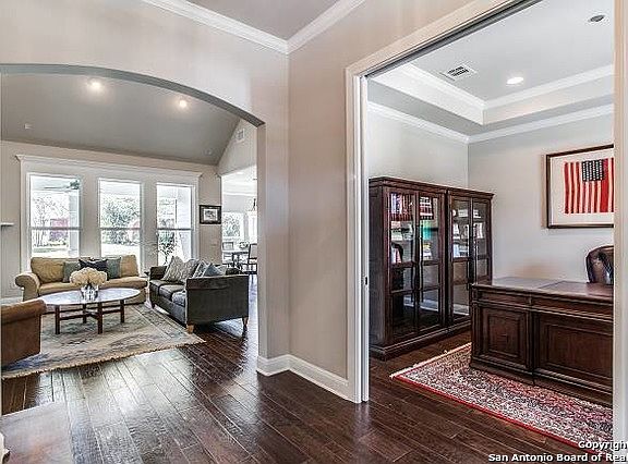 Inviting farmhouse style one story built in 2015. Clean, modern design elements. Hi ceilings/abundance of windows. Living area with corner fireplace open to the kitchen/dining area to enhance entertaining. Oversized kitchen island topped with Austral Pearl Italian quartzite/custom cabinetry/Bosch induction cooktop. Private master offers spa bath/dual vanity/soaking tub/walk-in shower/large walk-in closet. Second living area or study. Wonderful cov'd patio/huge yard for play&gardening. 2 car attached garage.