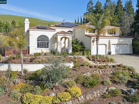 Fabulous custom-built Rancho Paraiso home with high ceilings and an open floor plan optimized for family living and entertainment. Located on a rare .42 acre lot with a stunning backyard oasis. Features include impressive living and dining rooms with two-story ceilings, fireplace and sunset views, large gourmet eat-in kitchen adjoins family room with fireplace that overlooks tranquil backyard. Main floor primary suite with wall of windows and patio door to backyard; two additional bedrooms/offices on main level; upstairs loft/ bonus room with 2 additional large bedrooms and views of the Valley. Oversize 3-car garage with extensive built-ins, owned solar for electricity, and a private entertainer's tropical backyard oasis with expansive low maintenance lawn, firepit, numerous patios with pergolas, palm and fruit trees, relaxing saltwater pool/spa, and so much more... New interior paint and flooring. Nearby local trails, Arbolado Park, Shadowbrook Winery, Mt. Diablo, Boundary Oak Golf and Whole Foods Shopping. Excellent Northgate Schools!