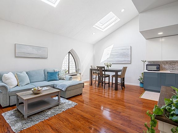 Rare opportunity to live in this one-of-a-kind home; The Abbey, an historic landmark building originally built in 1901 and later converted into 21 condos. Located on quiet, tree-lined, Hudson St, in the Heart of mid-town Hoboken! Unit features an open concept floor plan with huge vaulted ceilings, two large skylights that bring in tons of natural lighting, and spacious living area. Chef's kitchen with modern cabinetry and marble backsplash. Ornate, original stained glass window in the living room opens, allowing for fresh air and beautiful, dramatic lighting. The oversized bedroom is spacious enough to fit a California King bed with an additional stained glass window opening to views of greenery. The updated bathroom boasts modern tile flooring, recessed medicine cabinet and has a deep storage space next to the walk-in glass shower. Laundry located on the same floor, (building does allow owners to install their own if so desired), and a pet friendly building! Unit comes with 1 car parking included in maintenance in a covered garage nearby. Proximity to all this 1 mile, bustling city has to offer, including being close to the waterfront, shopping, restaurants, schools, worship, and transportation to NYC.