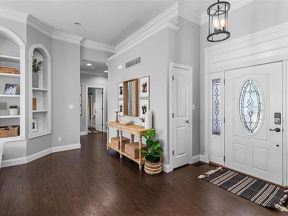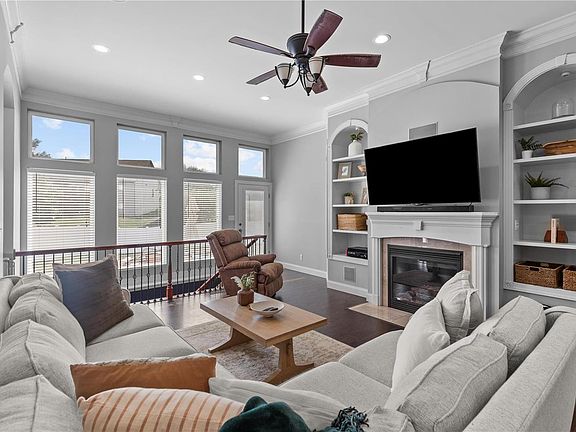 The lower level is designed for entertainment. It has epoxy-stained flooring, a large bedroom, a workout room, a full bath, and ample storage. Crown molding with backlighting adds to the ambiance for movie and game nights.