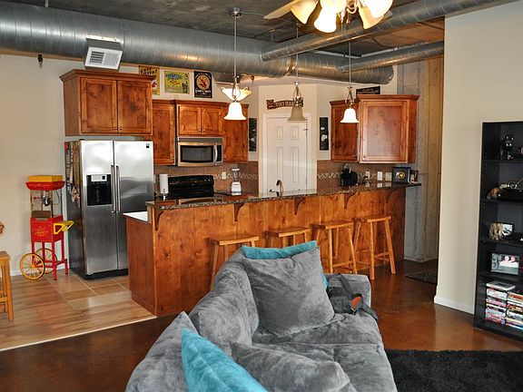 Here is your opportunity to own a move-in ready modern condo across the street from K-State and Aggieville! Located at one of Manhattan's premier locations, this gorgeous unit with contemporary finishes offers great open space for entertaining with remarkable quality throughout. Polished concrete floors, custom knotty alder cabinets, exposed ductwork and soaring ceilings give this condo an extra level of style. Generous bedrooms, 2 full baths, balcony and gated parking.