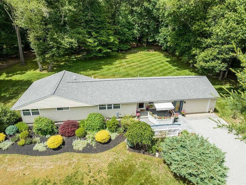 This spacious three bedroom, two and a half bath ranch-style home is located just steps from Quidnessett Country Club and a short ride to Goddard Park, Sandy Point Beach and the bike path. The open floor plan and updated kitchen and baths lend a contemporary feel to the house which also has central air and gas heat. The oversized bay window in the living room and large picture window in the kitchen let in plenty of sunshine and offer an expansive view of the yard which is set on just over an acre abutting conservation land that will never be developed. There is also a spiral staircase to the unfinished basement that offers plenty of space for expansion. The property, which is part of Pojac Point, has a stone wall all across the front border, mature, attractive plantings and a private patio with an awning on the front with another patio area located in the back of the home. Located less than 10 minutes from downtown East Greenwich and Wickford Harbor, this property offers plenty of space, privacy and easy access to shopping, restaurants, schools and more. First showings will be at the open house.