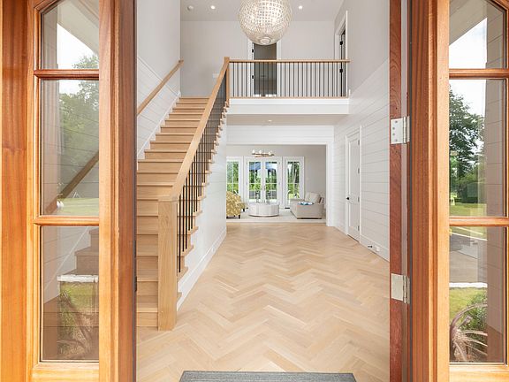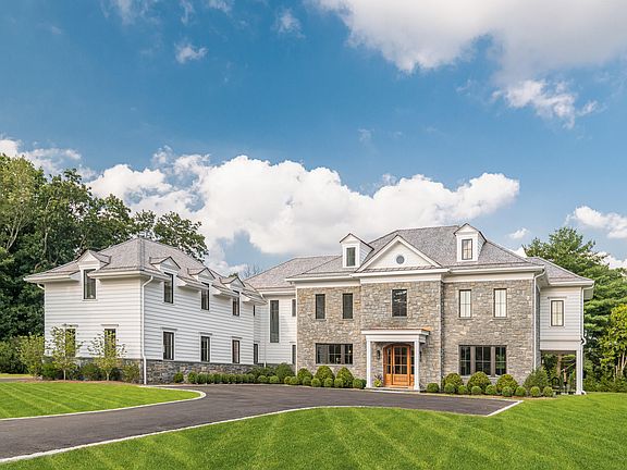 Nestled on a two-acre private lot, the drive up to this stunning almost 9000 square foot Connecticut estate is picturesque, a homeowner's dream. As you enter the grand, double story entrance, you're greeted by soaring 20-foot ceilings, dramatic floor-to-ceiling windows, and 8-foot doorways. This custom home is a model of quality craftsmanship. It boasts a sleek, open kitchen featuring a Viking six-burner gas stove and oven, an industrial-sized subzero refrigerator with wine cooler, an island with seating for five, and a marble top sideboard -- perfect for your morning coffee bar. With hardwood floors throughout the property, the grand staircase -- situated in the center of the home --