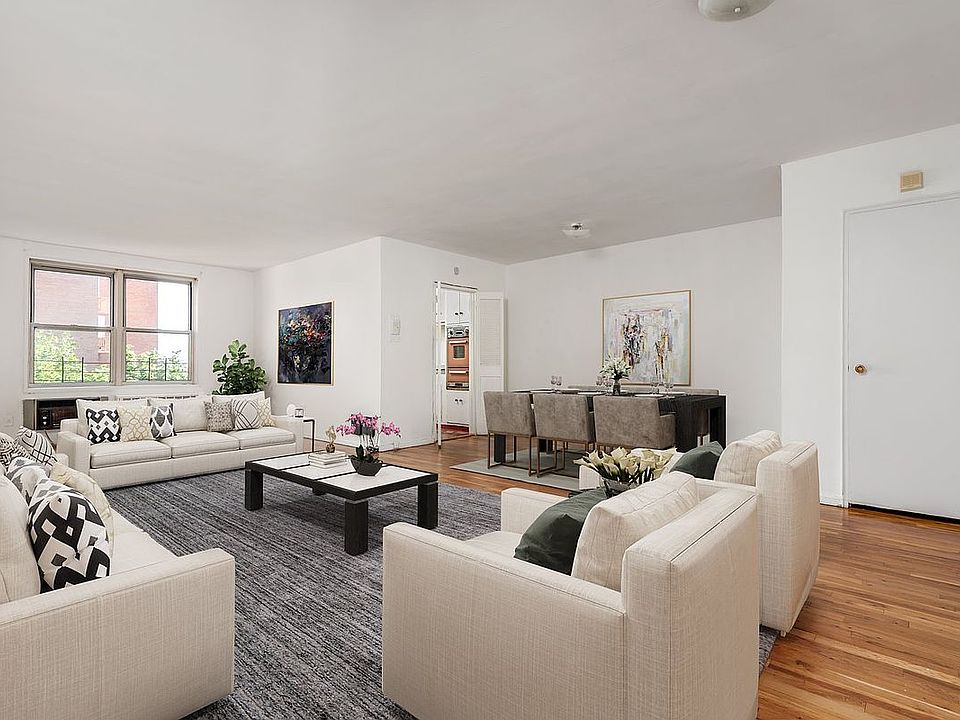 An enormous living room can be set up in many possible layouts, and a windowed eat-in kitchen can be opened with a breakfast counter. Pristine hardwood floors throughout. Five big closets.