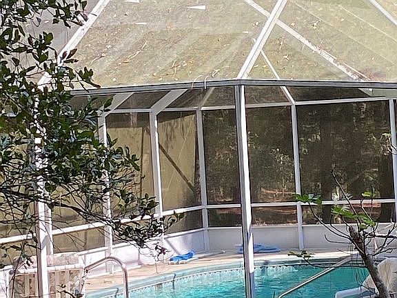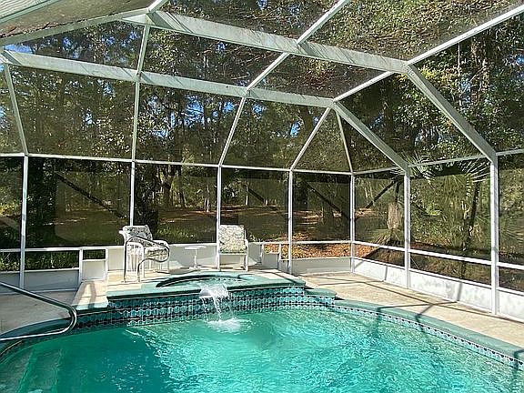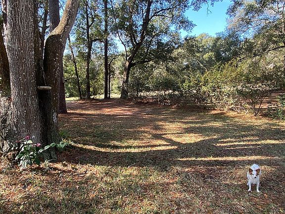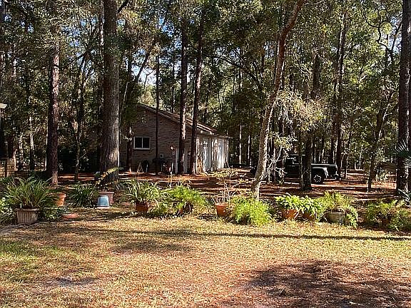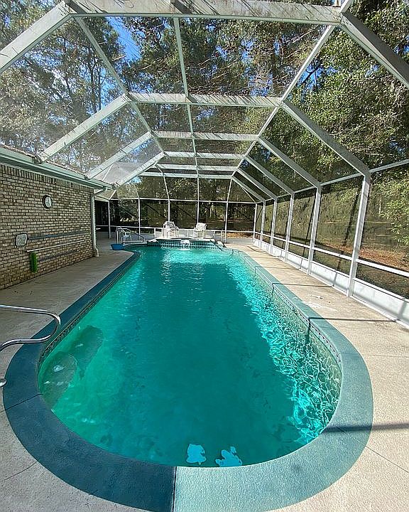 one story brick, fireplace, 2-car garage, laundry room, screened pool, separate screened porch, outdoor screened barbecue room, detached 1200 sq.ft. block garage with independent a/c and bathroom. City water, septic, no HOA, fenced 3.3-acre treed lot with excellent privacy.