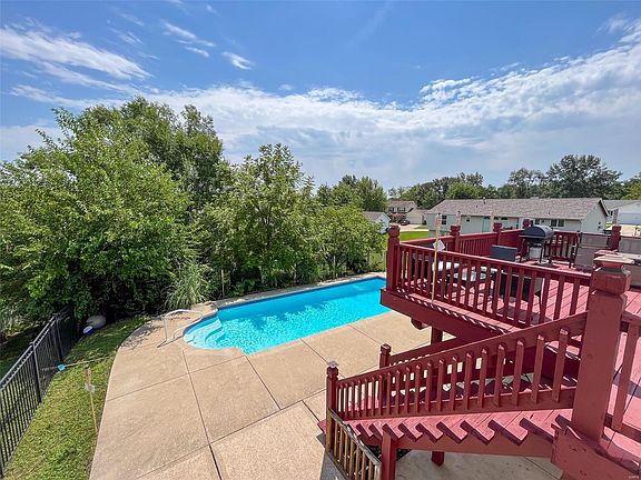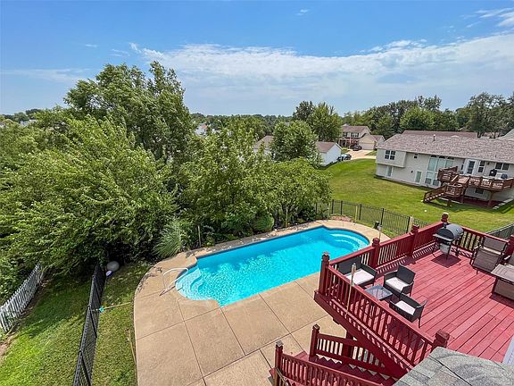 WOW! Your DREAM HOME! In-ground pool, quartz counters, finished basement, Francis Howell School district, this 4 bed, 3.5-bath home is mov4e-in ready! Main level features wood flooring, natural light, separate dining room w/custom lighting, office & sitting area, updated kitchen w/ quartz counters, center island, & stainless appliances. Living room with a wood-burning fireplace & bay windows, opening to a deck overlooking the pool. First-floor laundry. Upstairs, the master suite impresses w/ vaulted ceilings & remodeled bathroom featuring granite counters, double sink, jet tub, and an updated tile shower. Three addtnl bedrooms with new carpet & lighting, renovated full bathroom with granite. Finished basement with built-in fish tank, full bathroom, and walkout access to the pool area. Unwind in the backyard oasis with a 6.5ft deep in-ground pool, concrete patio, and wooden deck. Don't miss this captivating home, perfectly blending comfort and elegance in a sought-after neighborhood.