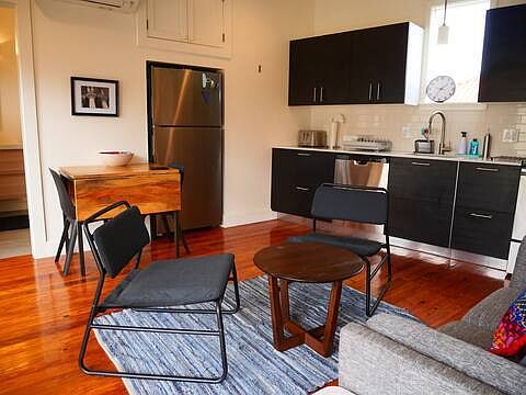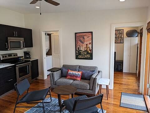 This is a furnished apartment on the upper level of a reconstructed (2017) servants' quarters in the back garden of a house in the Bayou St. John (Parkview, to be precise) neighbourhood. A one-year lease is required. The apartment is completely separate from the main house, with a second apartment below. Access from the street is via a walkway, a gate beside the main house, and a staircase. The landlords live in the main house. The apartment is about 500 square feet, with a bedroom (with closets), bathroom (tiled shower), and a combined living/dining/kitchen area. The flat is fully furnished, with linens, towels, kitchen equipment, and a washer-dryer. We're a 5-minute walk to N. Carrollton Ave., the Blue Oak BBQ, and the N. Carrollton at Dumaine streetcar stop. Rouses is a 10-minute walk, Winn-Dixie is 13 minutes, and Whole Foods is 24 minutes. There are air conditioning (and heating) mini-splits above the bed in the bedroom, and in the kitchen/living area. Landlord pays for water, hot water, and trash collection. The renter pays for all other electricity. There is no gas. Parking is on the street. Internet (AT&T fiber over Eero Mesh) is included. The lease will be 1 year. The tenant is responsible for leaving the apartment in the same condition as when they received it, subject to normal wear and tear. The owner pays for water, sewage, and hot water. The renter pays for all other electricity. There is no gas. Parking is on the street. Internet (AT&T fiber over Eero Mesh) is included The lease will be 1 year. The tenant is responsible for leaving the flat in the condition they received it, subject to normal wear and tear.