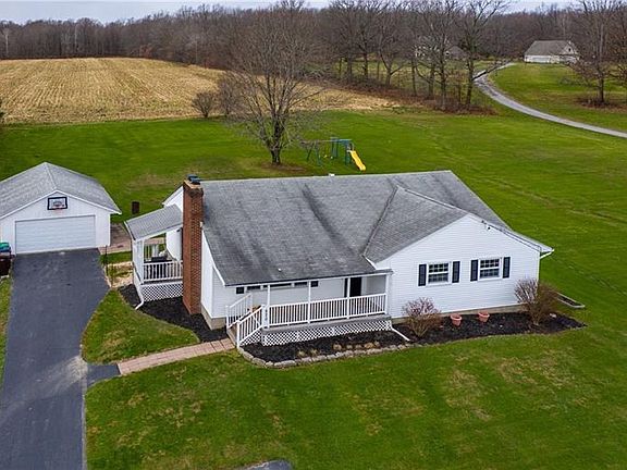 Enjoy all the country feels while still being close to town at this 3 bed- 2 full bath home. Walking up, the front porch welcomes you, leading in to a large entryway with original hardwood floors, a big living room with tons of natural light and stone, wood-burning fireplace, dining room with door to side porch, kitchen with loads of cabinet space, master suite with a bathroom that was recently added, 2 additional bedrooms and updated bath complete this floor. Basement that is great for storage and partially finished on one side. 2 car detached garage. All this is nestled on 1.43 acres...get ready, pack your things and move right in!