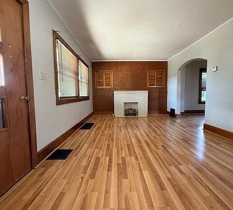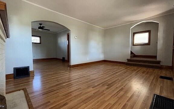 This move-in ready residence is located in a desirable Northeast Massillon neighborhood, offering convenient access to shopping, downtown amenities, and Route 21. The expansive front porch provides a versatile outdoor living area that is both inviting and functional. Interior enhancements include updated Pergo flooring, modern lighting fixtures, ceiling fans, and a newly installed electric fireplace insert with blower—perfect for added warmth and ambiance during colder months. Original woodwork and elegant arched doorways preserve the home's timeless character. The spacious main bathroom features abundant natural light and a generous linen closet. The full basement is clean, freshly painted, well-lit, and equipped with glass block windows for added security, offering ample storage space. The kitchen opens to a private, fenced backyard with a concrete patio ideal for outdoor dining and relaxation. A one-and-a-half-car garage provides additional storage capacity. Recent exterior improvements include a new roof installed in 2025 with Owens Corning shingles (transferable warranty) and upgraded replacement windows for enhanced efficiency and curb appeal.
