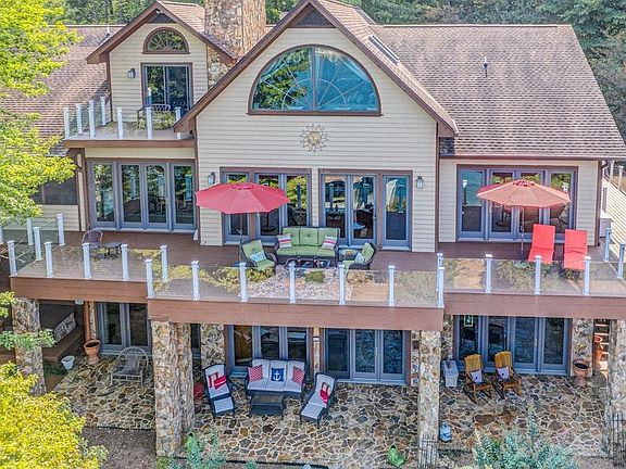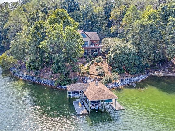 Somerset Cove-One of the best locations on the lake. Point lot within a cove with Views of Peaks of Otter and Apple Orchard Mountains. Wooded with over 2 acres offering complete privacy with over 445 ft of shoreline. Enormous boat dock with 3 boat slips and sandy beach. New Evergrain composite 2012 main deck Trex in 2016. Newer Low E Anderson Windows and Doors. Elevated ceilings with Wood beams in Great room with a massive stone masonry fireplace. Open Kitchen with dining area w Fireplace, adjoining decks and screened porch. Powder bath and Laundry near kitchen. Dining room and 2 guest suites with shared bath on main. Upper levels provides 2 guest room with FP & 1 full bath and office/library. Lower level has all tile flooring with guest suite w fireplace and full bath.