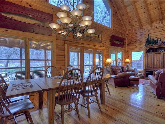 Toccoa River Living at it???s Best???Authentic Log Charmer has it all...this 3+ bedroom/2.5 bath lodge is situated on oversize, level river front tract in quaint community with the best view of the mountains & water to take in the most amazing sunsets???open & well appointed layout featuring ???massive wood burning fireplace??? in large family room & custom kitchen with plentiful cabinetry, spacious dining room, large laundry/mudroom, massive master suite boasts ensuite bath complete with jetted tub, shower, & his/hers walk in closet, soaring ceilings & log steps, view of the river from nearly every room, spacious upstairs features two private guest rooms, bath + large loft, family room opens to large screened porch, 2+ car garage features complete guest quarters above???2 bedrooms, 2 baths, den & kitchen, surplus storage + pole shed, exquisite outdoor area is complete with oversize pavilion that boasts large outdoor kitchen and dining area, hammock & hot tub deck, gentle boat ramp/canoe launch, outdoor storage building for ???river toys??? completely fenced yard with attractive gated entry, lush & level landscaped area surrounded by towering hardwoods...perfect for entertaining, interior & exterior boasts finishes & a style that speaks for itself....all of this is tucked away & tastefully furnished, yet just minutes from historic downtown Blue Ridge???perfect full time, vacation home, rental or corporate retreat - a must see!