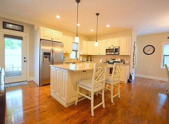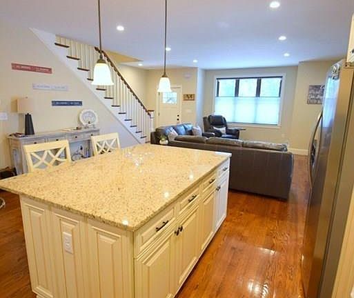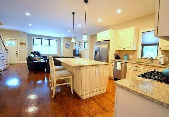 - Kit Dscrp: Flooring - Hardwood, Countertops - Stone/Granite/Solid, Recessed Lighting, Dining Area, Kitchen Island, Open Floor Plan, Main Level, Gas Stove, Crown Molding
