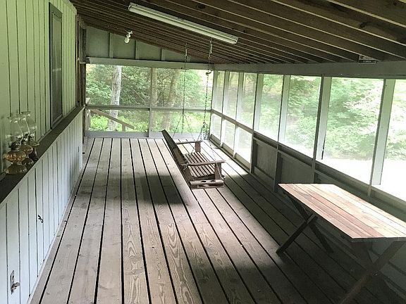 Updated cabin with over 250 foot of BOLD creek frontage, large flat yard and NO deed restrictions or HOA's! Located off a dead-end road, this property features gentle easy year-round access and a 2 car attached carport for all your toys. The 51 X 10 screened porch adds to the outdoor living space plus a deck that is adjacent to the noisy creek. Inside features a nice living room with gas-log fireplace and beautiful hardwood floors. Spacious kitchen was recently remodeled and features a breakfast nook. Primary bedroom has cedar-lined walk-in closet and private door leading out the creekside deck. Guest bedroom is large enough for two beds and is adjacent to the bathroom and laundry area. There is a large front and rear yard with storage building, workshop for hobbies, and creekside firepit. This would make an excellent vacation rental or a home for your family. Oh, and its sold furnished with an acceptable offer!