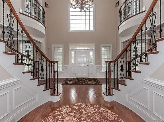 Estate Collection home in sought-after Marvin Creek, Marvin Ridge school zone. Neighborhood features beautiful Clubhouse with pool, tennis, playground and activities. Private .8 acre lot backs up to woods and walking trails. Be amazed the moment you enter. Sweeping double staircases greet you in the front foyer. Large formal spaces, coffered ceilings, huge open kitchen and floor plan. Sun room and office on first floor for extra living spaces. In-law or nanny suite with en suite full bath on first floor. Upgrades include 75 gallon water heater, 3 car garages, level back yard, well-fed full yard irrigation, automated pest control system, security system, landscape lighting and Juliet balconies. Gourmet kitchen with granite counters feature GE Monogram top-end appliances, wine cooler, and walk-in pantry. Spacious master bedroom with fireplace and private sitting area. En-suite baths, extensive storage. Home shows like new, VERY gently used, pet-free home. New roof and AC unit 2016.