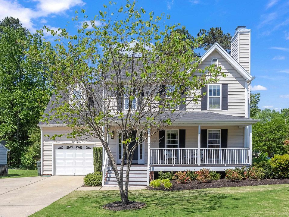Experience the charm & warmth of this exquisite house in the heart of North Raleigh. As you step onto the large front porch, you'll instantly feel welcomed by the cozy vibe & privacy offered by the corner lot. The fenced yard & garage provide ample space for outdoor activities, & the updated kitchen & baths add a modern touch to the cozy feel of the home. In addition, you'll feel secure with the new roof. The sodded yard & vibrant flowers, including roses, hydrangeas, & crepe myrtles, create a serene outdoor oasis perfect for relaxing on the deck while enjoying the sweet scents & the harmonious sounds of nature. The property offers a deep sense of connectedness to the outdoors, within walking distance of Durant Nature Park & Simms-Branch trail. This home provides the perfect balance of convenience & comfort, being just a stone's throw away from shopping, dining, 540, & schools. This is an opportunity to own a home that offers a strong sense of community, relaxation, & convenience, making it the perfect place to call home. Take advantage of this fantastic opportunity, as homes in Windsor Forest sell in a weekend!