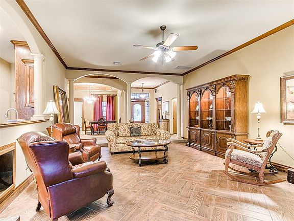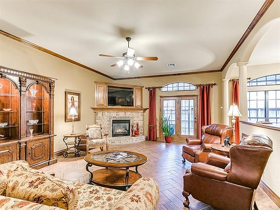 Welcome home. This gorgeous, custom built, one-owner home is nestled in the coveted Harvest Hills neighborhood. Although listed as a 4 bedroom home, there are two additional rooms with closets that could be utilized as bedrooms, office space, baby nursery, game room etc. The living room features 10'+ ceilings with beautiful wood look tile. Recent renovations include, new tile and carpet, new roof and fresh paint. Kitchen boasts beautiful cabinetry and separate coffee bar. Primary bedroom is separate from the additional bedrooms and showcases a fabulous fireplace with exterior door to patio. Primary bath has extra large walk in shower and whirlpool tub. Storage room in garage could be converted back into a 3 car garage. Dual unit ac/heat. All window coverings and bar stools remain with the house. Large back patio is covered and has natural gas hookup for a grill or fire pit and rolling sun shades.Other upgrades consist of whole house attic fan (yes you read that right) custom shutoff plumbing manifold, elegant columns, custom wood cabinetry throughout and custom drapes. Roof replaced in late 2023 with Class 4 shingles transferable lifetime warranty. Located in a quiet cul-de-sac with fabulous neighbors, this home will not last long!