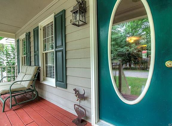 Charming Colonial style home with full front porch and private wooded lot. Great floor plan with spacious family room with wood burning brick fireplace, handsome laminate wood flooring, and french doors that lead to deck. Formal dining room with laminate wood flooring. Awesome eat in kitchen with stainless steel appliances that convey, granite countertops, island, nook, ceramic tile flooring and backsplash, decorative chair rail, and built in pantry. First floor laundry mud room is conveniently located right beside the garage entry. Upstairs are four spacious bedrooms including large master suite with walk in closet, linen closet, and private bath. Second floor has brand new carpet. Other features include: HVAC and hot water heater less than 5 years old, 30 year dimensional shingles, attached storage shed, wooded rear yard, deck, and full front porch. Home is located on a quiet cul de sac street.