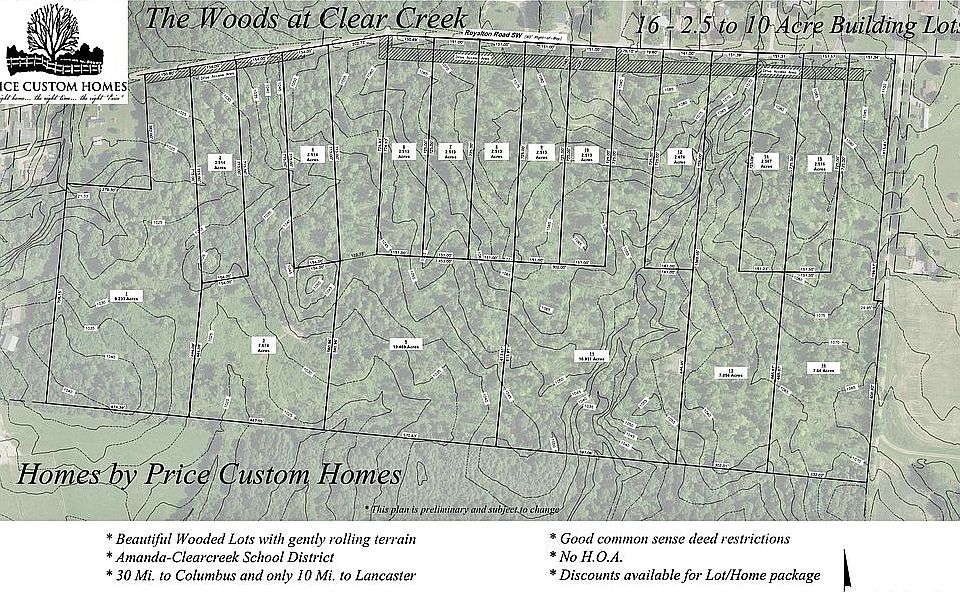 Excited to announce The Woods at Clear Creek! 16 new wooded building lots coming soon to Royalton Rd! Amanda-Clearcreek Schools, no HOA and good common sense deed restrictions. Homes by Price Custom Homes! The overall property will consist of 2.5 to 10 acre lots, lot prices will range from $40,000 per acre up to $50,000 per acre. Beautiful rolling terrain, winding creek and enough trees to provide a peaceful private setting. The attached preliminary sketch plan is subject to change. More information will be available early 2023.