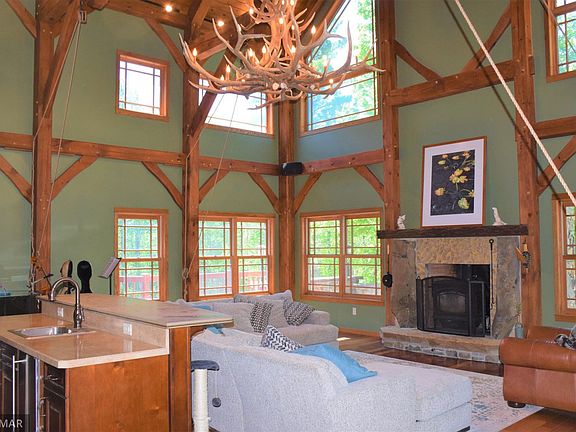 This home is an architectural masterpiece!! 10 Acres on Little Bass Lake with complete privacy. There are some of the finest building materials available on the market today in this home. Timber frame construction and the masonry work is EXTENSIVE, inside and out!! The fireplaces are arguable unrivaled in the state!! If you're adventurous, there are two large zipline towers and the one-of-a-kind outdoor fireplace is also a climbing wall. There is a fossil top bar with museum quality fish fossils. High end woodwork everywhere! Slate and granite throughout, a home gym, sauna, patios, decks, two kitchens, two libraries, lofted bedrooms in the kids' rooms with jack & jill baths and heated floors. With so much more to see check out the virtual tour & drone video of this beautiful home then call for your private tour today!