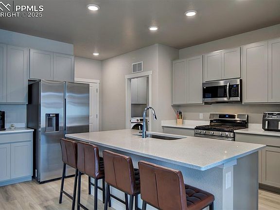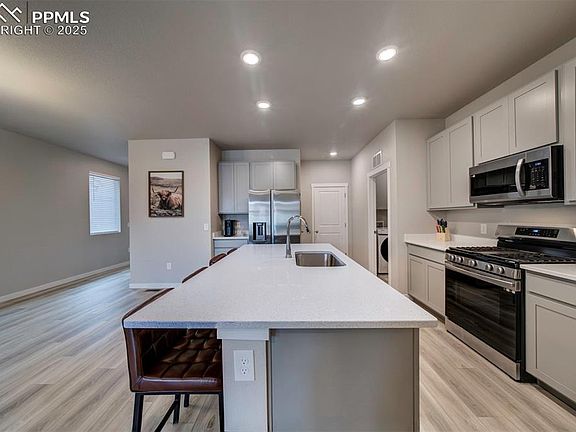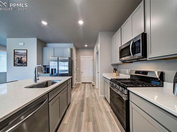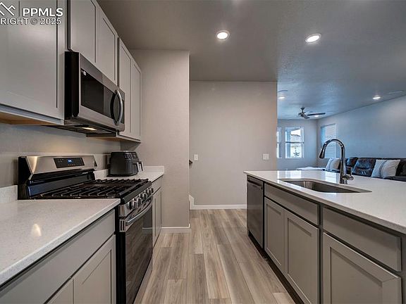 Welcome to this stunning four-bedroom, two-and-a-half-bathroom townhouse, located in a prime area with easy access to shopping centers, Powers Corridor, and I-25. As an end unit with no backyard neighbors, it offers both privacy and tranquility, complete with a two-car garage, built in ceiling speakers in the living room and luxurious LVP flooring on the main level. Main level is complete with primary bedroom with 4 piece bathroom and walk in closet. The upper level features a versatile loft space ideal for relaxation, entertainment or an office, along with an additional full bathroom and remaining bedrooms. Enjoy the brand-new park located in the community, perfect for outdoor activities and family fun. This townhouse is less than a year old and showcases the pride of homeownership from its original owner—don’t miss your chance to call this property home!