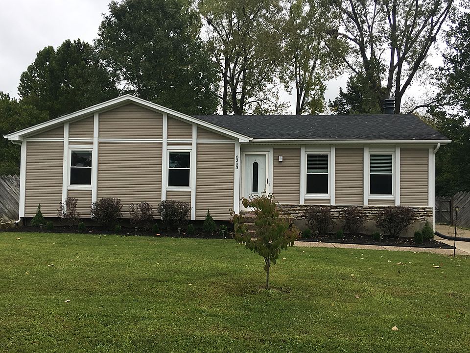MOVE IN READY!! This home is basically brand new! Completely remodeled in 2015. Large corner lot with beautiful landscaping in Apple Valley subdivision. This house sits at the very back, one of the last houses on the road, so not many cars coming by, and park like views across the street! When you walk in, you will notice the vaulted ceiling in the living room, beautiful laminate wood floors throughout and fireplace. Straight through the living room is the kitchen with all new cabinets, countertops, and appliances, and french doors that lead out to the back yard. Off the kitchen is the utility and laundry room. Down the hall, you have two closets, a fully remodeled main bath with new cabinetry, tub, and tiled shower, along with two spare bedrooms with generous size closets. The master in the home is large for the size of the home with a vaulted ceiling, two closets, and private bathroom with new cabinet, shower, and tile. Through the French doors you walk out to the fenced back yard with a new storage shed. New siding, windows and roof in 2012. Call for showing appointments, or stop by the open house! 502-445-2774