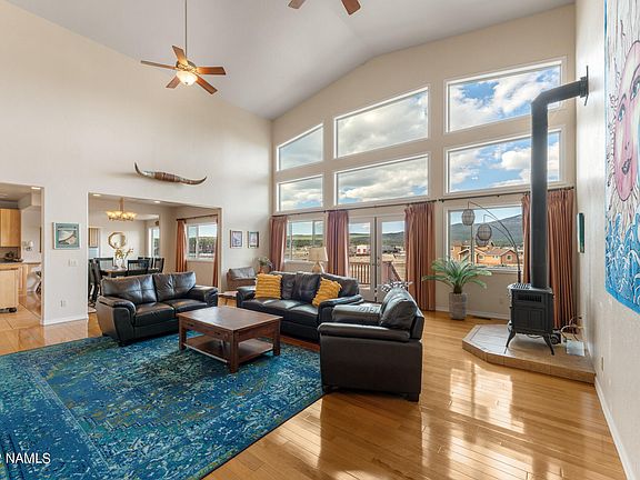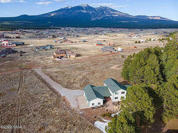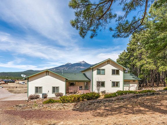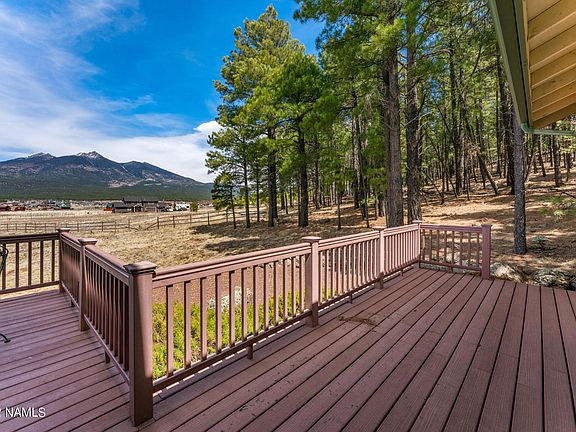 Fort Valley home backing to forest service awaits your arrival for the lifestyle you have been seeking. Elevated setting offers a stunning view of the Peaks. Ponderosa pines provide a private rear yard with landscaping, rock walls and patio. This home has classic appeal with solid construction you feel the moment you walk in the door. Floor- to-ceiling windows in living area, elegant wood flooring and open living and dining areas. Primary bedroom suite has access to the large wrap-around front deck. Two bedrooms share the jack & jill bathroom. Additional sleeping area with murphy bed and 1/2 bath. Upper level is large open loft and sitting area. Room for all your vehicles in the oversized 3-car garage plus det. 3-car garage. Private well w/ 7,500 gal storage, natural gas. No HO