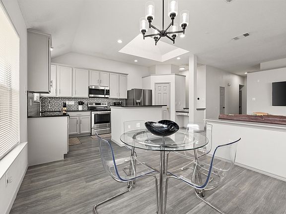 Stylish and completely updated, this beautiful home features an inviting covered front porch. The open floor plan with high ceilings creates the perfect space for entertaining. The spacious living room is centered around a cozy fireplace, while the modern kitchen boasts granite countertops, beautiful backsplash, stainless steel appliances, a pantry, and island. The primary suite offers a walk-in closet and a spa-like bath with double sinks, a jetted tub, and a subway-tiled shower. Three additional bedrooms provide ample closet space, while the full bathroom showcases sleek granite countertops. Updated lighting and ceiling fans enhance the home throughout, complemented by luxury vinyl plank flooring. An oversized garage offers ample storage, and the fenced backyard provides plenty of space to relax and enjoy.