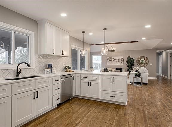 STUNNING RENOVATED LEAWOOD RANCH. You wont want to miss this rare ranch with a full finished daylight/walkup basement. Walls have been moved to give this a wide open floor plan. Home features hardwoods throughout the first floor a true office with large bay window, large laundry room off the kitchen, vaulted ceilings in the family room, beautiful built-ins in family room and office. Custom kitchen cabinets, ss appliance with a gas range, quartz and plenty of storage. Master bath has oversized walk-in shower, luxury tile, master bedroom has large walk-in closet. The full finished basement with 1 bedroom egress window and private bathroom perfect for guest, it also has wet bar and a half bath which will satisfy all your entertaining needs. True office/non conforming 5th bedroom. Home sits on a large treed lot and has a covered patio so you can grill in the rain. New windows, new plumbing, mostly new electrical, new gutters and down spouts, new sliding door, Just about everything you can think of!