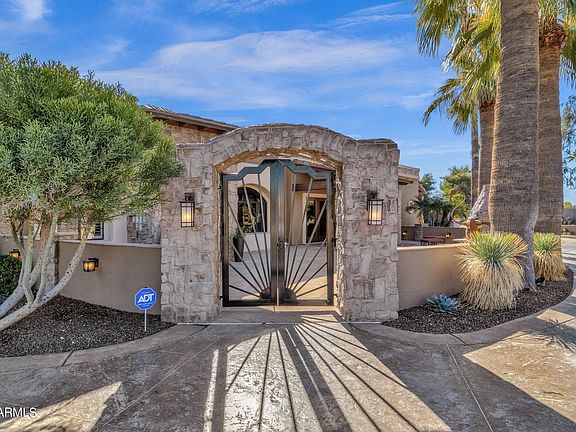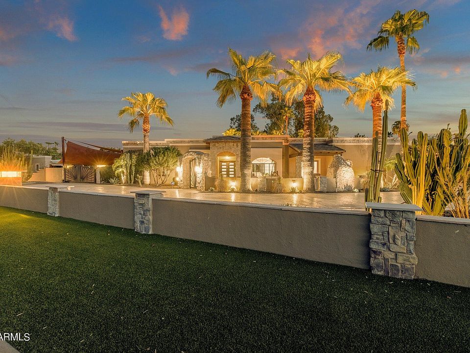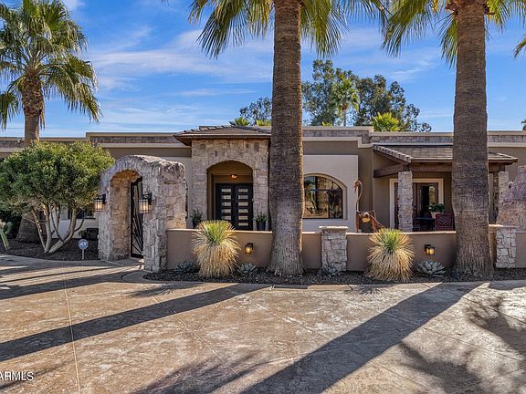 Masterful design and modern luxury combine to showcase tremendous updates at this stunning home with 4 beds and 2.5 baths in the main house and 1 bed and bath in the detached 1000sqft casita! Each detail was carefully chosen and quality crafted from the tongue and groove ceiling of the patio to the modern flooring throughout the property. Entertain in grand style in a gourmet kitchen with porcelain waterfall edge counter tops and backsplash, custom light fixtures and high end luxury appliances. A lavish primary sanctuary with ensuite bath offers glass-enclosed shower, modern tub and backlit mirror and walk-in closet. Generous secondary bedrooms and a remodeled dual sink bath with glass-enclosed negative edge shower assures your guests every comfort. Appreciate a plush theater room... and 210-bottle temperature-controlled wine room. A detached casita offers another bedroom, massive living room and bath. The car enthusiast will appreciate the 4-car garage and 2 RV parking spots. The backyard boasts huge spa, heated pool, water feature, outdoor shower, outdoor kitchen with Viking grill, pizza oven, gazebo with fireplace, lush turf yard and lots of palm trees. This marvelous home offers something for everyone!