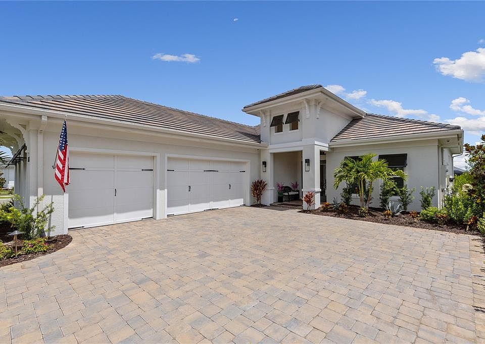 This Birchwood III floor plan is a Stock Home which includes 3 bedrooms, 2 full baths, a half bath, den and three car garage. Upgrades include CUSTOM CEILING AND WALL detail, DESIGNER LIGHTING, wood floors and upgraded carpet. The kitchen includes upgraded appliances, cabinet organizers, Quartz countertops and natural gas. The owners retreat includes two walk-in closets, freestanding tub, dual vanities, and linen closet. The Great Room sliders allow open access to a perfect lanai space for easy living or elegant entertaining a custom built heated pool and spa, large, covered seating and dining areas, and built-in outdoor kitchen.