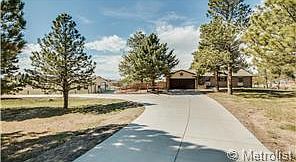Great views of Front Range.Beautiful walk out ranch on almost 3 acres in Ponderosa Hills. Trees , views, Totally remodeled basement and kitchen. Has 44x32 out building with a 400 sq.ft. office. also has 4 stall barn plus arena. Perfect for in some on who want close in horse property. Perfect for inlaw apartment in walk out basement. Paved roads and circular drive. New roof.