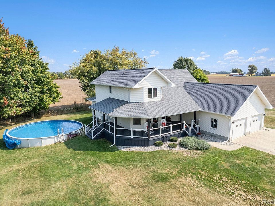 Welcome to 8206 N McCaffrey Rd, a spectacular custom-built home that combines all of the charm of country living with many modern updates! This home is in an area eligible for the Zero Down Rural Development Loan - ask your lender for more details! You'll know this home is special from the moment you pull up the drive. Sit for awhile on the wraparound porch built with Trex decking (2022), enjoy taking a dip in the gorgeous 30 ft pool (2023), or sit under the multitude of stars around the firepit. The first view as you open the front door will take your breath away, there's just no other home like it. With soaring 20ft vaulted wood plank ceilings, the living space is open and inviting. There is a comfy sitting area, a room that could be used as an office or studio, an open kitchen with island, and the large primary bedroom with en suite full bath. Upstairs you'll find two more large bedrooms, one with custom-built loft bed frame that can hold 3 full-sized mattresses. The full bath upstairs as well as the half bath downstairs have been updated with new flooring, vanities, toilets, and lighting (2023). The furnace, central air, and heat pump were all replaced in 2015. Perhaps the most impressive update to this incredible home is the new roof (2022) with a Lifetime Warranty! Valued at over 50,000, it uses additional rubber in its materials, causing hail to bounce right off! This home has been owned and loved by members of the same family since it was built. They have loved their country lifestyle, complete with visits from the deer and turkeys, and living in a place where the loudest sounds are the breezes in the trees. This home is in the Chesaning Union school district, and is centrally located to New Lothrop, Chesaning, Owosso, and Corunna.