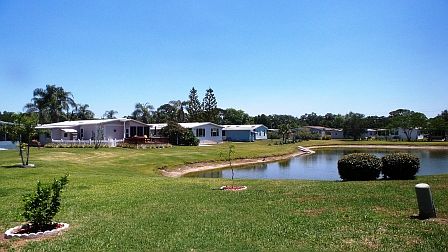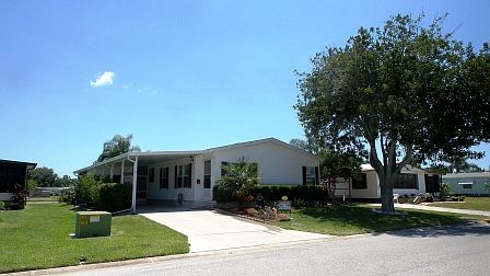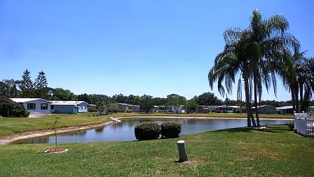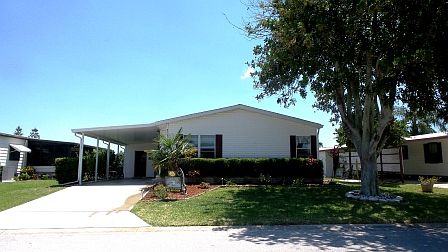 MAKE AN OFFER TODAY! This 1991 large double wide is unique by design and features a screened in lanai with a hot tub, indoor laundry as well as a lake view. The living room is huge with a rounded archway leading to the hallway and a small arched opening to display items of decor. One accent wall is painted a lovely robin's egg blue and gives the room a Spanish hacienda appeal. A formal dining area off the living room has a special lighting fixture. The big eat in kitchen boasts a total of 30 plus cabinets which have been freshly painted, and updated appliances. The kitchen flows into a sun room with new tile flooring that gives one an unrestricted view of the lake. Off the living room is a hallway that leads one to a guest bathroom and bedroom. This bathroom and the master bathroom both have new toilets and flooring. The humongous master bedroom has a walk in closet, a mirrored angled wall, and a separate sitting/office area, which has a perfect view of the lake. The home has several Spanish influenced arches throughout. A very large storage shed behind the hot tub and off the carport has even more storage. The home comes with some furniture for each room and area. The furniture has been tastefully selected and adds to the ambiance of the home. This home is ready to move in and take advantage of both the space and the gorgeous water views. Located in the 55+ Community of Colony Cove. Lot rent is $997.