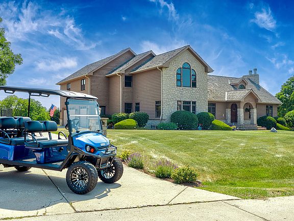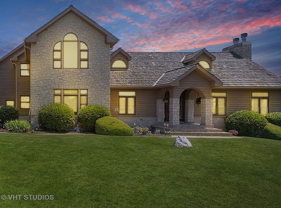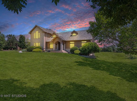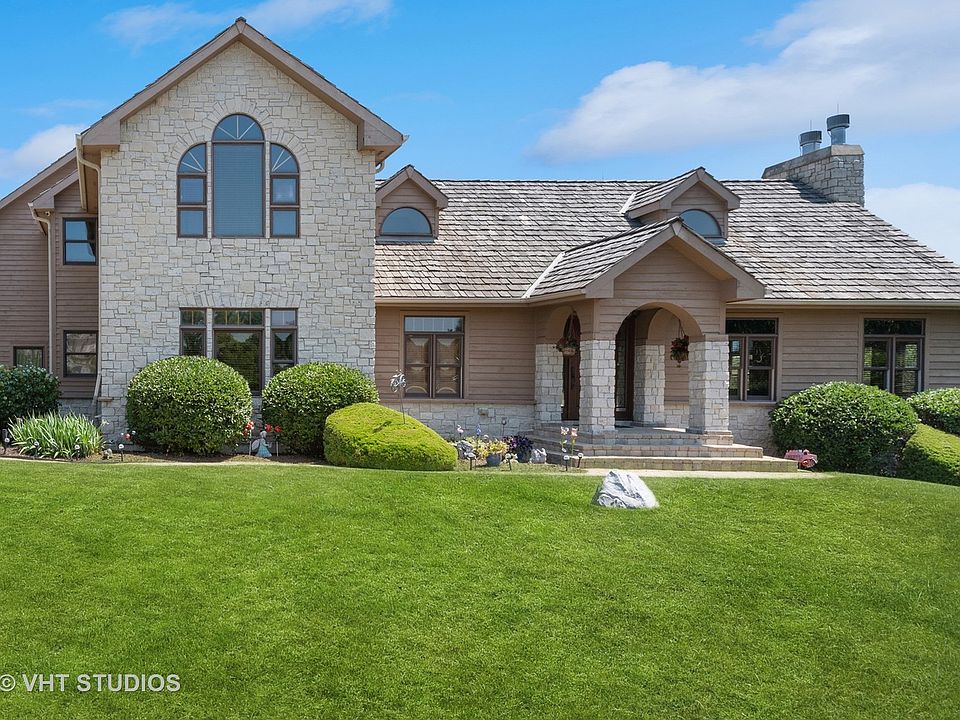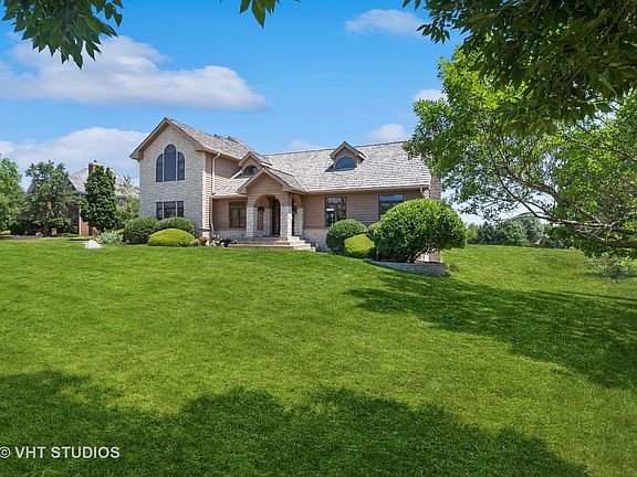 Situated upon a meticulously landscaped one acre corner lot, this EXCEPTIONAL custom built stone and cedar two story home will WOW you the moment you walk through the front door! The spacious open floor plan, curved walls and soaring ceilings have the aesthetic appeal of a Colorado mountain home right here in the Midwest! Offering 4 bedrooms, 4.1 bathrooms and 5500 square feet of stunning living space, this home has countless surprises throughout! Featuring TWO master bedroom suites, one on the first level, a 2nd level family room, and lower level great room and bar! The rich wood tones of the gleaming cherry flooring and beamed cathedral ceilings welcome you to the living room boasting a beautiful two story fireplace and built in bookcases. TAKE IN THE BACKYARD SCENERY in the adjoining turret style dining room with 180 degree window views! Boasting a generous amount of 42" cherry cabinetry, granite countertops, stainless steel appliances, Porcelain tile flooring, and a huge 4 seat breakfast bar, this GOURMET KITCHEN will be the center of every gathering! A professionally installed 360 degree CCTV camera system is included and can be monitored from the kitchen as well as a computer or phone app. Enjoy the sunrise and a cup of coffee on the NEW large deck off of the kitchen. YOU WILL NEVER WANT TO LEAVE the first floor master suite which offers a huge walk in closet with a built in ironing board, a spa like bathroom with a Jacuzzi tub and walk in shower, dual sink vanity, and an adjacent den with glass French doors! As you ascend to the second level, stop and take in the view of the first floor living room, it is breathtaking! YOU WILL BE DELIGHTED as you are greeted with the large yet cozy 2nd level family featuring a vaulted ceiling and loads of natural light through the Palladian window. Adjacent you will find a convenient laundry room and attic access. The roomy 2nd master suite is just down the hall and is equipped with a full ensuite bathroom with a Jacuzzi tub and separate shower. Two other spacious bedrooms complete the 2nd floor and are serviced by a full bathroom. THE FINISHED WALKOUT BASEMENT features amenities galore and a few surprises too! This space is perfect for hosting parties or is ideal for an in-law arrangement! The lighted sunken great room has a theatre setup and rear bar seating/snack counter and a beautiful slate surround fireplace! PERHAPS A GAME OF POOL, PINBALL OR POKER? We have you covered in the 32 x 30 game room/bar with a full bathroom! The 3 season room offers additional living space and allows you to enjoy the everchanging colors of all of the seasons! JUST WAIT until you see the lower level garage/workshop! This unique 6 CAR two story garage features a heated main level Spancrete 3 car garage and another 3 car garage/workshop on the lower level! Plenty of room for your tractors, golf cart or yard tools! The walk out doors lead to an expansive patio, perfect for a hot tub or relaxing in the shade! TENNIS, PICKLEBALL OR BASKETBALL ANYONE? The full size multi court will provide hours of competitive fun for all! Featuring FlexCourt tiles, Lifetime Goalsetter Basketball Hoops and 12 ft. gates. OH BUT WAIT, THERE IS MORE! Some of the many updates include: NEW furnace, LED Smart Lighting Throughout, 24 Inch Thick Concrete Driveway, Full Security System, Roof Lightning Rods, Radon Mitigation System, Well Maintained Cedar Shake Roof, Dual Zoned HVAC System, App Controlled Garage Doors, Surge Protection, New Well Pressure Tank in 2020, Reverse Osmosis Systems, Wood Blinds Throughout, New A/C Condenser in 2021, and New Sump Pump in 2021. The Sundial Farms Subdivision is a friendly and welcoming golf cart community offering horse boarding, RV storage, and neighbors Chain O'Lakes State Park and all of the amenities it offers. Located in an award winning school district, only minutes to the Metra Station, shopping and recreation in Lake Geneva too!