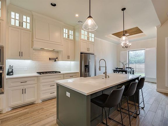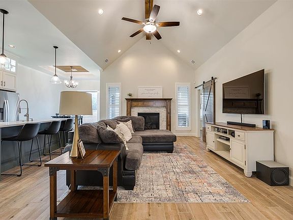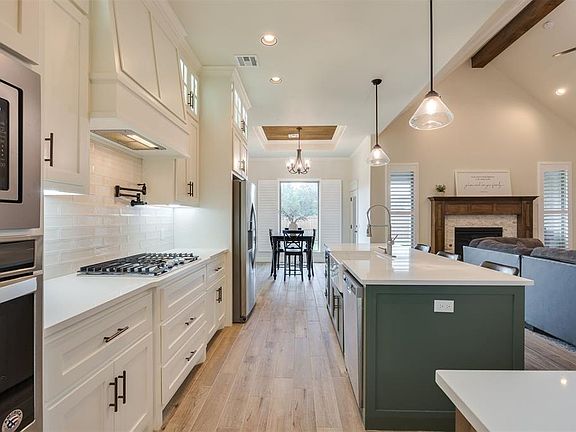 This beautiful home offers a perfect blend of elegance, functionality and modern design. Situated in a highly desirable gated neighborhood, this property presents an exceptional opportunity for comfortable living. As you enter, you'll be captivated by the grand foyer, adorned with high ceilings and exquisite wood-look tile flooring. The spacious living room provides a warm and inviting atmosphere with large windows next to the gas fireplace that bathe the space in natural light. The heart of this home lies in the well-appointed kitchen, a chef's dream come true. It boasts sleek quartz countertops, a gas stove, pot filler, farmhouse sink, ample custom cabinetry, a center island with a breakfast bar, stainless steel appliances and an oversized walk-in pantry. Retreat to the luxurious primary suite, featuring a generous bedroom area and a spa-like ensuite bathroom. The primary bathroom showcases a soaking tub, a walk-in shower, dual vanities and a sizable walk-in closet. Two additional spacious bedrooms with an optional 4th bedroom/office. Step outside into the backyard oasis, where you will find a covered patio with an outdoor fireplace that is ideal for entertaining and relaxation. This home also features concrete coating in garage, front porch and back patio, energy efficient features that will save you money on your utility bills. Plus, it is just minutes away from I-35 so you can easily get where you need to go. Lastly, the whole home generator provides peace of mind in case of an emergency. This home has it all - don't miss out!