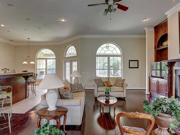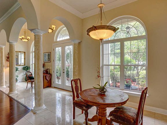 This exquisite 3 bedroom/2 bath home in the Palm Bay subdivision is a showstopper. As you enter the double stained glass front door into the marble tile foyer, the open floor plan with 12' ceilings and arched windows invite you in with tons of natural light. The marble floors wrap around to the open formal dining area with more arched windows. The living area is inviting with rich colored hardwood floors, and matching exquisitely carved wood mantle with arched built-in bookcases. The deep color and details of the mantle and built-ins extend into the kitchen which includes high-end cabinets, marble countertops, tile floors, stainless steel appliances, and wraparound bar that overlooks the breakfast area. The master suite has French doors that lead to the covered paver